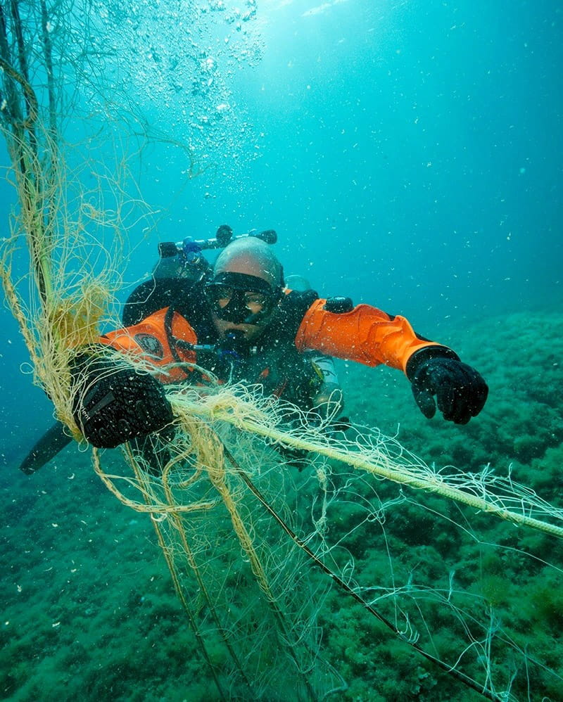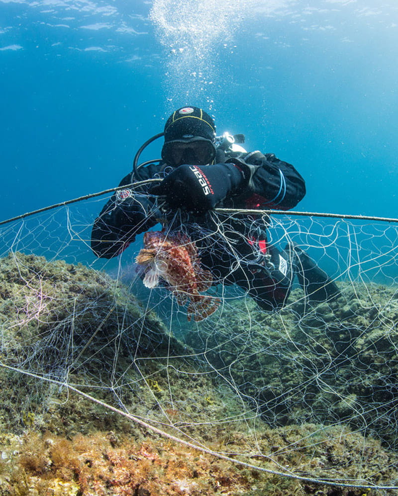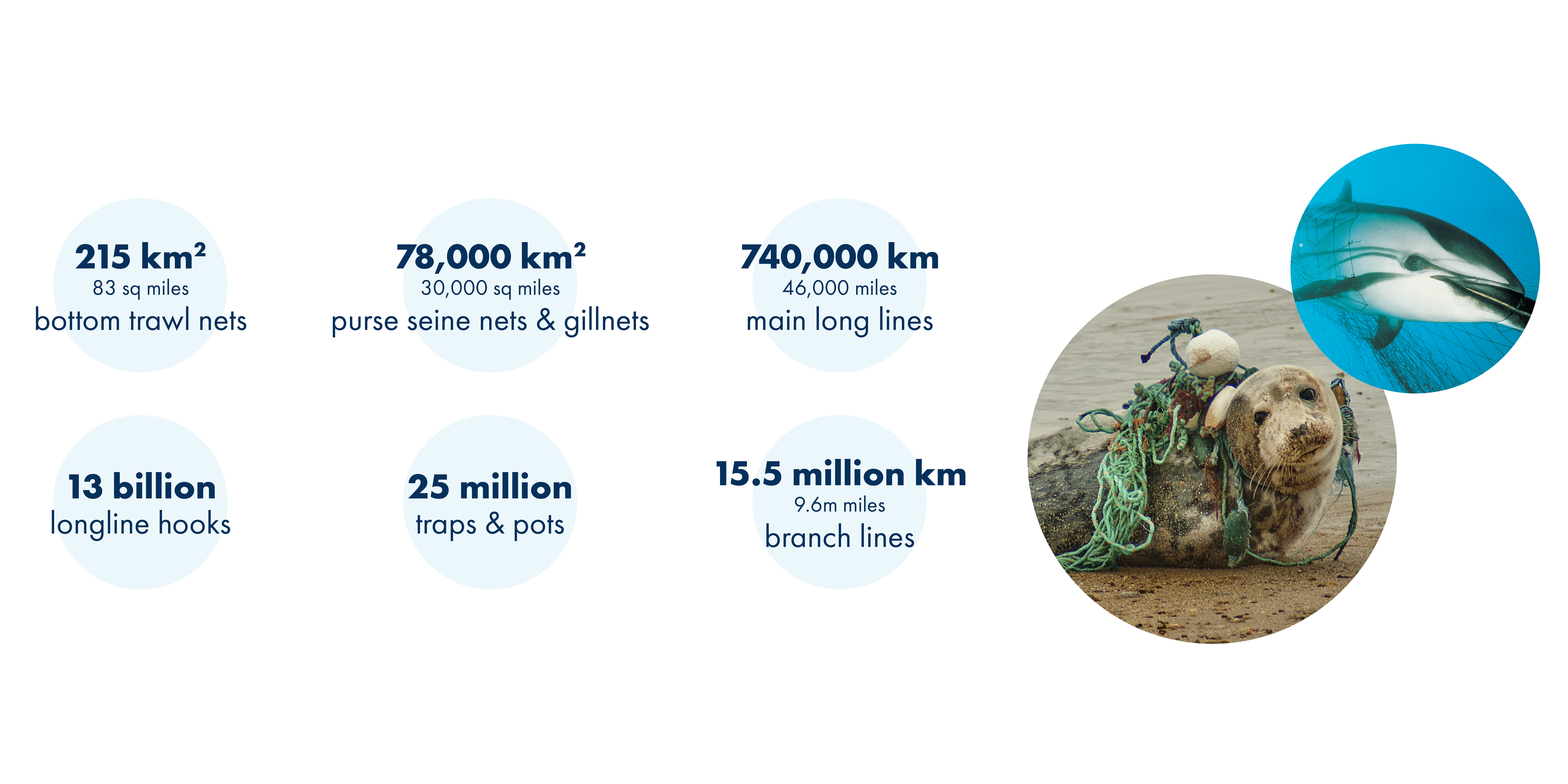 Ponieważ sprzęt rybacki został zaprojektowany do chwytania i zabijania zwierząt morskich, nieuchronnie prowadzi to do milionów uwięzionych i zabitych stworzeń, takich jak rekiny, płaszczki, żółwie morskie, delfiny, wieloryby, skorupiaki i ptaki morskie. Szacuje się, że pojedyncza porzucona sieć zabija średnio 500 000 bezkręgowców morskich (np. kraby i krewetki), 1 700 ryb oraz cztery ptaki morskie.